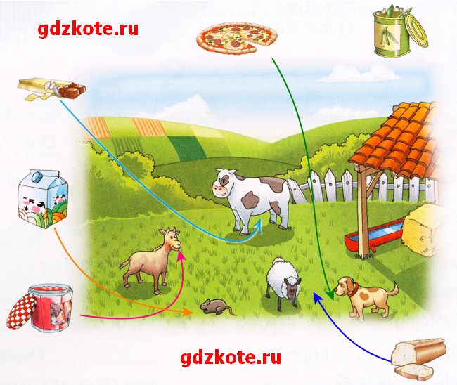 Послушай диалог и укажи стрелкой, где находятся продукты.