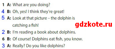 A: Look at that picture – the dolphin is catching a fish! – [Лу:к эт з’э’т пикчэ – з’е долфин из кэ’тчин: э фиш!] – Посмотри вот на эту картинку – дельфин ловит рыбу!