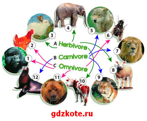 B) Carnivore: wolf, lion, tiger, seal. – [Ка:ниво: вулф, лайэн, тайгэ:, си:л]Плотоядные: волк, лев, тигр, тюлень.