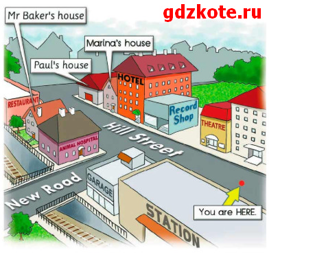 B: Go along Hill Street, go pass the theatre and the record shop and Marina’s house. It’s opposite the restaurant. – Идите по Хилл стрит, пройдите мимо театра, музыкального магазина и дома Марины. Он напротив ресторана.
