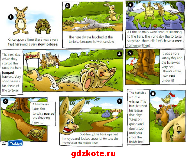 8. The tortoise was the winner! The hare learned his lesson that day: ‘Keep on going and don’t stop until you cross the finnish line!’ – [З’е то:тэс уоз з’е уинэ:! З’е хеэ: лё:нд хиз лэссн з’е дэй Ки:п он гоин: энд донт стоп антил ю крос з’е финиш лайн!] – Черепаха победила! А заяц усвоил урок: «Продолжай движение и не останавливайся, пока не пересечешь финишную линию!»