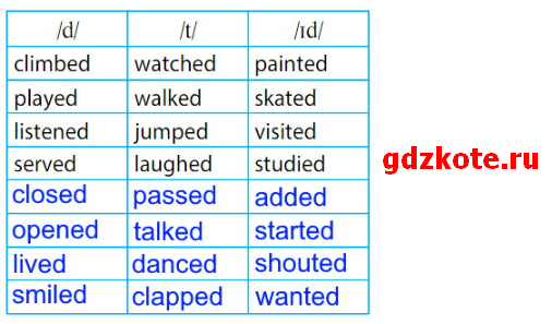 Read. Copy the table. Then put the words passed, closed, opened, added, started, talked, lived, shouted, danced, wanted, smiled, clapped in the right column – Прочитай. Перерисуй таблицу в тетрадь. Затем поставь глаголы в правильную колонку.