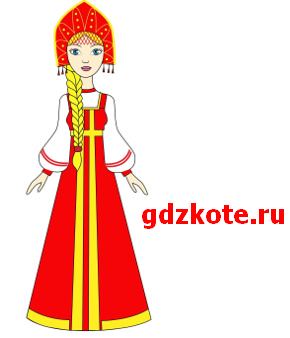 Это русский национальный костюм для женщин. В нём есть длинное белое платье, красный передник, а на голове женщины красный головной убор.