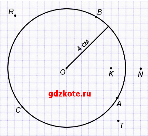в) Отметьте точку N на расстоянии 5 см от центра окружности и точку К на расстоянии 3 см от центра окружности. Какая из отмеченных точек лежит вне круга, а какая – внутри круга, ограниченного окружностью?