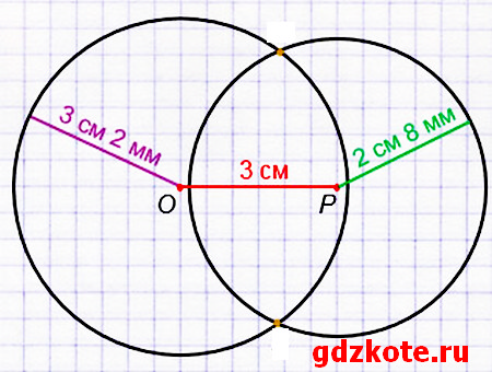 Изобразите точки О и Р, расстояние между которыми 3 см. Проведите окружность с центром в точке О и радиусом 3 см 2 мм и окружность с центром в точке Р и радиусом 2 см 8 мм. Сколько точек пересечения имеют построенные окружности?