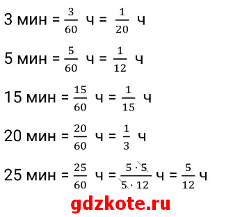 Какую часть часа составляют 3 мин, 5 мин, 15 мин, 20 мин, 25 мин? Ответы запишите в виде несократимой дроби.