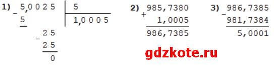 б) 985,738 + 5,0025 : 5 – 981,7384 = 5,0001