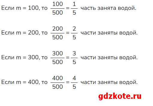В детский бассейн объемом 500 л налили m л воды. Какая часть объема бассейна занята водой? Ответ дайте при m = 100; m = 200; m = 300; m = 400.