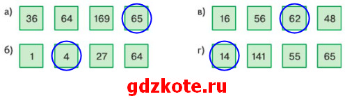 а) Число 65 – лишнее, т.к. оно не является квадратом натурального числа.