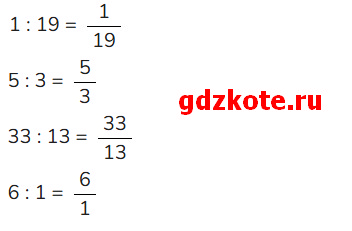 а) Представьте в виде дроби частные 1 : 19, 5 : 3, 33 : 13 и 6 : 1.