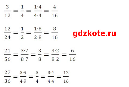 Сократите дроби 3/12, 12/24, 21/56, 27/36, а потом приведите их к знаменателю 16.