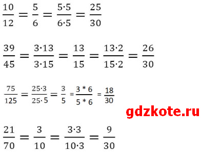 Сократите дроби 10/12, 39/45, 75/125, 21/70, а потом приведите их к знаменателю 30.