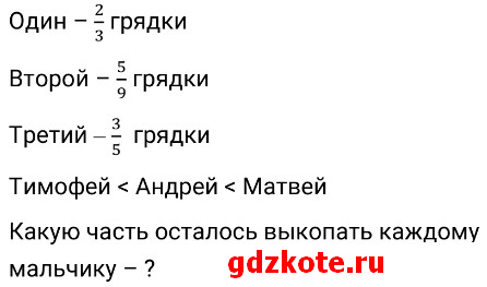 Три брата Андрей, Матвей и Тимофей вскапывали грядки одинаковой длины. За одно и то же время один вскопал 2/3 грядки, другой – 5/9 грядки, а третий – 3/5 грядки. Какую часть грядки осталось вскопать каждому, если известно, что Андрей вскопал больше Тимофея, а Матвей – больше Андрея?