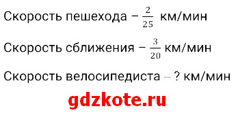 Велосипедист увидел впереди себя пешехода, идущего в том же направлении со скоростью 2/25 км/мин. С какой скоростью двигался велосипедист, если каждую минуту он приближался к пешеходу на 3/20 км?