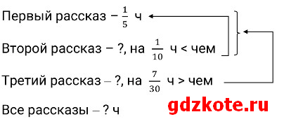 Марина читала три рассказа своему младшему брату. Она прочитала первый рассказ за 1/5 ч, второй рассказ она читала на 1/10 ч меньше, а чтение третьего рассказа заняло на 7/30 ч больше, чем чтение первого и второго рассказов вместе. Сколько времени Марина читала все рассказы?