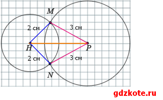 Проведите отрезок НР, длина которого равна 4 см. Постройте окружность с центром Н и радиусом 2 см и окружность с центром Р и радиусом 3 см. Точки пересечения окружностей обозначьте буквами М и N. Сравните длины отрезок МН, НN, PM и NP.