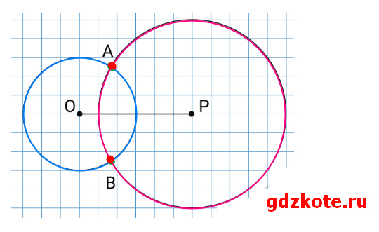 Проведите окружность с центром в точке О радиусом 1 см 5 мм (рис. 5.22). Отметьте такую точку Р, чтобы ОР = 3 см. Используя циркуль, постройте на окружности точки, удалённые от точки Р на 25 мм.
