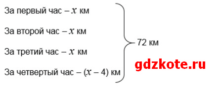 Пусть в первые три часа Миша проезжал по х км, тогда за четвёртый час он проехал (х – 4) км.