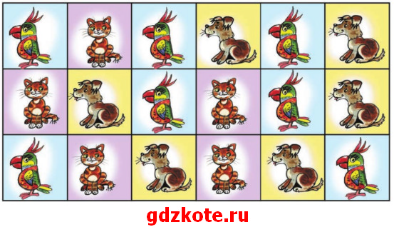 Развивай внимание. На рисунке 6,24 изображены попугаи, кошки и собаки. Сосчитайте их, считая всех подряд по порядку: первый попугай, первая кошка, второй попугай, первая собака, третий попугай и т.д. Если не получится сосчитать с первого раза, попробуйте выполнить это задание несколько раз.