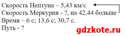 Скорость обращения вокруг Солнца планеты Нептун (самой отдаленной от Солнца) равна 5,43 км/с, скорость планеты Меркурий (самой близкой к Солнцу) на 42,44 км/с больше. Сколько километров пройдет каждая планета за 6 с, 13,6 с, 30,7 с?