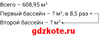 Пусть в первом бассейне х м3 воды, тогда во втором – 8,5х м3 воды. Известно, что всего в двух бассейнах вместе 608,95 м3 воды.