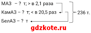 Пусть на КамАЗ можно погрузить х т руды, тогда на МАЗ – 2,1х т, а на БелАЗ – 20,5х т. Известно, что вместе они вывозят 236 т руды.