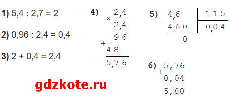 б) (5,4 : 2,7 + 0,96 : 2,4) · 2,4 + 0,046 : 1,15 = 5,8
