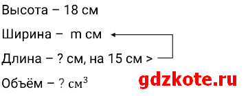 Составьте выражение для нахождения объёма прямоугольного параллелепипеда, если его высота 18 см, ширина m см, а длина на 15 см больше ширины.