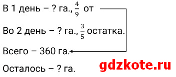 1) 360 : 9 ∙ 4 = 40 ∙ 4 = 160 (га) – засеяно в первый день