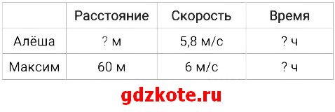 На уроке физкультуры надо было пробежать дистанцию 60 м. Максим и Алеша стартовали одновременно. Максим бежал со скоростью 6 м/с, а Алёша – 5,8 м/с. На каком расстоянии от финиша будет Алёша, когда Максим пробежит всю дистанцию?